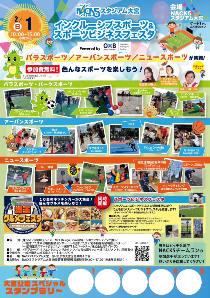2月1日(日)に、NACK5スタジアム大宮(大宮公園サッカー場)にて、さいたま市の目指す「笑顔あふれる日本一のスポーツ先進都市の創造」の実現に向け、アーバンスポーツ、障がい者スポーツ、ニュースポーツなど、様々なスポーツが体験できる「インクルーシブスポーツフェスタ」を開催します。